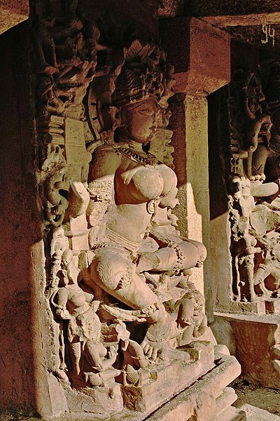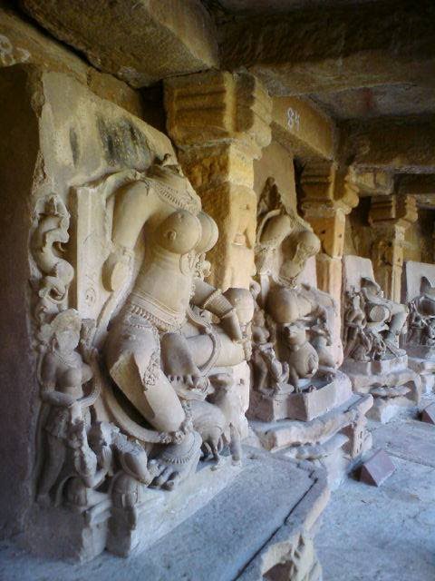 Another is Shri Aingini. A small-sized Ganesh stands at her left leg. However far from all the statues are intact: marauding armies invaded this place in 1564 so many of the yoginis in this Chausat Yogini mandir are decapitated and some are in stages of repair. In the centre of the complex stands the Gauri Shankara mandir.