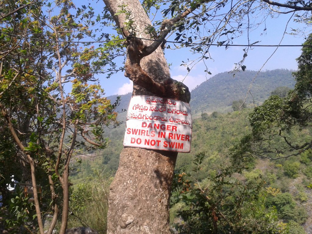 Another local piece of lore has it that just above the shivling, there is a stone formation resembling a cow, thus linking it to the river Gosthani (cow`s udder in Sanskrit) which originates from here. The river is a sinuous silver streak glimpsed from on high. It flows for a good 120 kms before joining the Bay of Bengal through an estuary near Bheemunipatnam. It is also the chief source of drinking water to the city of Visakhapatnam. We come across a signboard that says succinctly enough: Danger. Swirls in river. Do not swim.