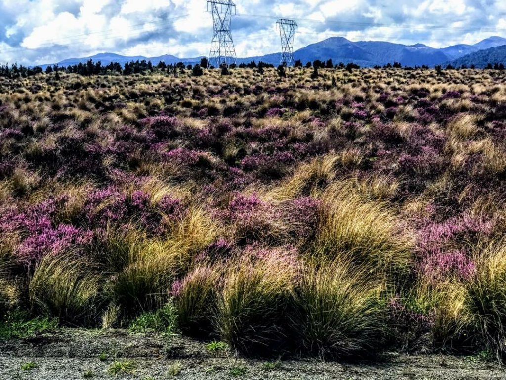 The sky hangs large and startlingly low over beech forests hedged with giant fern, stand after stand of pine that serve as windbreakers, trees contorted into intricate shapes by the force of the gales that blow in from the Pacific Ocean as well as the Tasman Sea and shrub-like gorse and heather, which bloom bright yellow and deep purple.