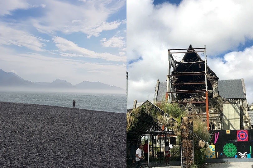 Kaikoura, scene of a big quake in 2016; a badly damaged church in Christchurch from the 2011 quake.