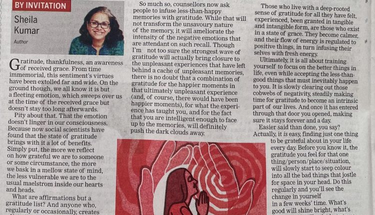 So much so, counsellors now ask people to infuse less- than- happy memories with gratitude. While that will not transform the unsavoury nature of the memory, it will ameliorate the intensity of the negative emotions that are attendant on such recall. Though I’m not too sure the strongest wave of gratitude will actually bring closure to the unpleasant experiences that have left behind a cache of unpleasant memories, there is no doubt that a combination of gratitude for the happier moments in that ultimately unpleasant experience (and of course, there would have been happier moments), for what the experience has taught you, and for the fact that you are intelligent enough to face up to the memories, will definitely push the dark clouds away.