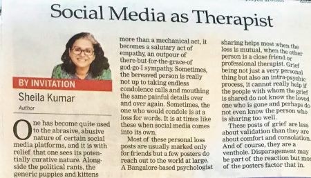 Social media as therapist One has become quite used to the abrasive, abusive nature of certain social media platforms, and it is with relief that one sees its potentially curative nature. Alongside the political rants, the generic puppies and kittens pics, the humble-brag travel and acquisition posts, I started to see people posting about intensely…